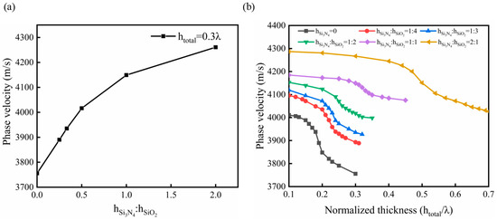 Relationship between phase velocity of SAW and (a) the ratio of Si3N4 layer thickness and (b) thickness of waveguide layer with different ratios of Si3N4 and SiO2.