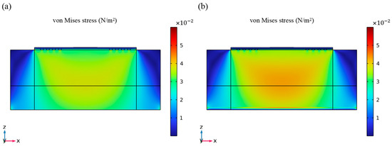 In the given equation, , , , , , t, and represent the elastic constants, particle displacements, piezoelectric moduli, electric potential, mass density, time, and dielectric tensors of the material, respectively. The elastic moduli and density of the medium vary with strain. Studies have shown that the mass sensitivity of SAW sensors is related to the stress state and contact stiffness of its surface [33]. In order to explore the influence of Si3N4 materials on the stress state of the sensor, the stress distribution of the FEM model was analyzed with and without the Si3N4 layer in the waveguiding layer. The stress distribution of the sensor caused by an external load of 6 × 10−6 Pa under the working state was calculated when the total thickness of the waveguiding layer was 0.2 λ, as shown in Figure 7. When the same load is applied, the Si3N4 waveguiding layer significantly increases the surface stress of the sensor.