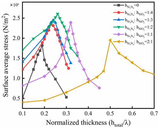 To further explore the influence mechanism of the Si3N4 waveguiding layer on the vibration state of the sensor, the changes in the surface average stress of the sensor were calculated, as shown in Figure 8. Within the calculation range, the surface average stress of sensor models with different ratios of waveguiding layer thickness ramps up and reaches the peak value. When there is no Si3N4 material in the waveguiding layer, the surface average stress of the sensor reaches the peak value when the total thickness of the waveguiding layer is 0.19 λ. Within a certain range, the surface stress is enhanced with the increase of the thickness ratio of the Si3N4 layer. Specifically, when the thickness ratio of the Si3N4 layer to the SiO2 layer is 1:2, and the total thickness of the waveguiding layer is 0.26 λ, the surface average stress of the sensor reaches the peak value. The peak value is increased by approximately 45% compared to the sensor model without Si3N4 material. According to the piezoelectric equation and the description in previous studies, the increase in surface stress and strain corresponds to the increase of the change of phase velocity, which will lead to an increase in the sensor’s sensitivity to mass loads.