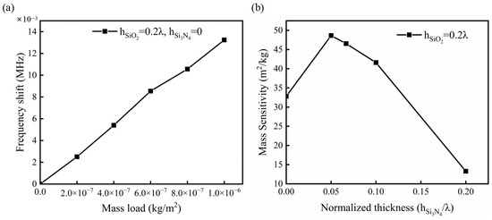 (a) Relationship between frequency shift of the sensor and mass load; (b) Relationship between mass sensitivity of the device and the layer thickness of Si3N4.