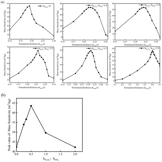 (a) Relationship between the mass sensitivity and the total thickness. (b) Relationship between the peak value of mass sensitivity and layer thickness ratio.