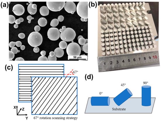 Ni50.8Ti49.2 powder was prepared by Minatech Ltd. (Shenzhen, China) using the electrode induction-melting gas atomization (EIGA) technique. The main composition (wt.%) of the NiTi powder was determined to be 55.80 wt.% Ni, 0.0576 wt.% O, 0.0066 wt.% C, 0.0067 wt.% N, and balance Ti. Figure 1a shows the scanning electron microscopy (SEM) image of the NiTi powder, which exhibits a regular spherical shape with less satellite powder, and the size range of the powder particles is from 15 μm to 53 μm (D50 = 36.8 μm). As shown in Figure 1b, three sets of cylindrical specimens were prepared with a height of 10 mm and a diameter of 6 mm. Figure 1c shows the scanning strategy of 67° rotation angles between the adjacent layers. The LPBF processing was performed in a BLT (BLT S210, Shaanxi, China) machine equipped with a 500 W ytterbium-doped laser under argon protection to keep the oxygen level below 100 ppm. Previous research has shown that NiTi alloys exhibits favorable superelasticity and low porosity when exposed to the energy density of about 72 J/mm3. To control independent variables, the same process parameters and different building directions are applied. Table 1 shows the optimized parameters in the LPBF processing, and the energy density was calculated with E = P/vht [].