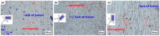As shown in Figure 2, the OM images of the 0°, 45° and 90° samples demonstrate that the porosity defects represented by the black dots are distributed inside the grains and at the grain boundaries. It is noteworthy that the unmelted defects are concentrated at the melt pool boundaries. Specifically, the 0° samples have more unmelted defects but smaller sizes and fewer porosity defects. The 90° samples have more serious porosity defects and fewer unmelted defects, while the number and size of unmelted defects and porosity defects of the 45° sample are moderate. Actually, the difference in the building direction changes the defect distribution of the samples. During LPBF processing, different thermal histories result in different grain solidification directions and differences in convection, leading to differences in the distribution of unmelted defects and differences in microporous defects []. In addition, the spattering of the molten metal varies depending on the direction of solidification, leading to differences in the distribution of the defects [,,,].
