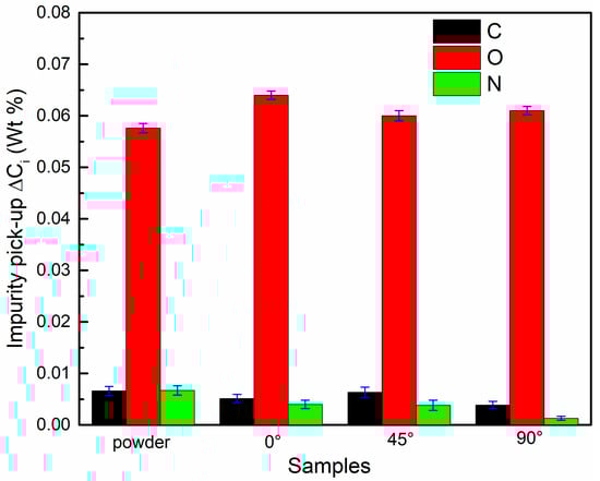 Slight changes in the Ni/Ti ratios can cause drastic changes in the phase transformation temperatures [,]. Among them, the introduction of impurity elements could change the phase composition of the samples by forming the second phases, i.e., Ti4Ni2OX, TiN, TiO2 and TiC, which will change the transformation temperatures. The functional properties of the samples will change further [,]. Chemical element analysis was performed on the virgin powder and the samples. The results are shown in Figure 3, and the LPBF samples have a slightly higher oxygen content than the virgin powder. Among them, the 0° sample has the highest oxygen content, while the 45° sample has the lowest. The results are consistent with the analysis of the OM images, where the 0° sample has the highest number of defects, while the 45° sample has the lowest number of defects. In addition, the carbon and nitrogen contents of the as-fabricated samples are lower than those of the virgin powder, which indicates that the high temperature of the laser cladding process acts on the powder, resulting in the loss of carbon or nitrogen.