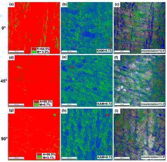 (a–c) EBSD analyses of the 0° sample. (d–f) EBSD analyses of the 45°sample. (g–i) EBSD analyses of the 90°sample. (a,d,g) Phase composition analyses. (b,e,h) KAM analyses. (c,f,i) Grain boundary distribution analyses.