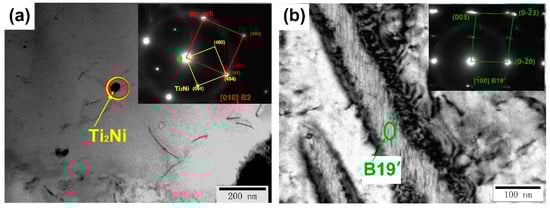 (a) Bright field image and selected area electron diffraction in the corresponding circle region for the 0° sample (matrix and Ti2Ni phase). (b) Bright field image and selected electron diffraction in the corresponding elliptic region for the 0° sample.