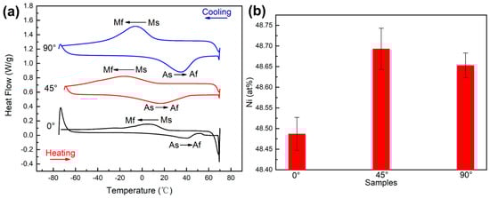 The reversible phase transformation between the austenite phase and martensite phase is the theoretical basis for the shape memory effect and superelasticity of NiTi alloys. Among them, the martensite start temperature (Ms), martensite finish temperature (Mf), austenite start temperature (As) and austenite finish temperature (Af) are the important phase transformation temperatures during the phase transformation process. Figure 9a shows the result of the DSC measurement of the three samples. The corresponding phase transformation temperatures obtained by the tangent method are listed in Table 2. The Ms values of the 0°, 45° and 90° samples are 22.1 °C, 11.4 °C and 13 °C, respectively. Obviously, the Ms of the 0° sample was the highest, while that of the 45° sample was the lowest. Correspondingly, the order of the martensite phase content in all samples at ambient temperature (15 °C) was 0° sample > 90° sample > 45° sample, which is consistent with the result of the EBSD analysis. For each sample, five EDS results were collected to calculate the average value, and the Ni content results are shown in Figure 9b. It can be seen that the higher the Ni content of the sample, the lower the phase transformation temperature, which is consistent with the DSC results.