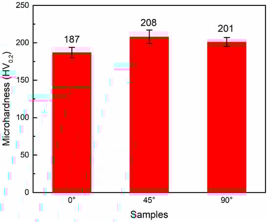 Figure 10 shows the microhardness test results for the three samples, with the 45° sample having the highest microhardness and the 0° sample having the lowest microhardness. Generally, dislocation densities are an important factor for the microhardness of metallic materials. The increase in the dislocation density could lead to an increase in the matrix strength and hardness of the material. As described in Section 3.2, the 45° sample has the highest dislocation density, while the dislocation densities of the 0° and 90° samples were relatively low; therefore, as a result, the highest microhardness values were obtained for the 45° samples. In addition to the dislocation density, phase transformation is also an important factor affecting the microhardness. Stress-induced martensite phase transformation and martensite reorientation may occur during microhardness testing, which can lead to a change in the microhardness values []. Based on the phase transformation temperature (Table 2), we can see that the 0° sample has the highest phase transformation temperatures, followed by the 90° sample, while the 45° sample has the lowest. However, as shown in Figure 10, the trend of the microhardness values of the 0° sample, 45° sample and 90° sample are opposite to the phase transformation temperatures: 45° sample > 90° sample > 0° sample. A high phase transformation temperature is prone to induce the stress-induced martensite phase transformation, and martensite reorientation may occur with less difficulty. Therefore, the microhardness value of the 0° sample was the lowest.