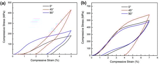 Figure 11 shows the compression stress–strain curves. The recoverable strains and recovery ratios are shown in Table 3. As shown in Figure 11a, all the samples were subjected to a strain of 5% at 15 °C. Table 3 shows that the 45° sample has the highest recoverable strain of 3.2%, while the lowest recoverable strain is 1.8% for the 0° sample under the conditions above. As described in the phase transformation temperature section, the Ms of the 45° sample is the lowest compared with the others. Therefore, during the superelasticity test, the 45° sample with the highest proportion of the austenite phase shows the greatest driving force of recovery and the highest recoverable strain.