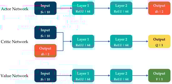 SAC is a Deep RL (DRL) actor-critic algorithm that uses an off-policy approach, which distinguishes between the data collection policy and the agent policy during the learning process through an entropy regularization framework []. This algorithm uses a replay buffer to store past experiences and reuse them, so it reduces the need for the agent to collect new samples all the time in each iteration. SAC employs three neural networks that not only compute the action predictions for the current state but also generate a temporal-difference error signal for every time step. These three networks are the actor network to approximate the policy, the value network to approximate the state value, and finally, the critic network to approximate the Q-value [].