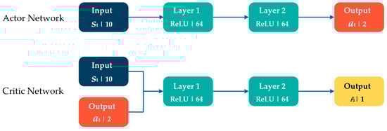 On the other hand, TRPO is a DRL actor-critic algorithm that uses an on-policy approach to employ the same policy for both exploration and exploitation. One of the primary contributions of this algorithm is that it uses a trust region [] to restrict the update size during training, which ensures monotonic improvement []. TRPO employs two neural networks (actor and critic networks) to collect samples and refine the current policy. Similar to the SAC algorithm, the input layer in the actor network is observations from the environment, while the output layer provides the actions. Additionally, the input layer of the critic network consists of the observations from the environment. As an additional input, it also receives actions taken by the agent. The output of the citric network is an advantage function () which is employed to make the training updates. The network configuration of the TRPO was similar to the SAC algorithm in terms of layers and activation functions to ensure comparable results, as shown in Figure 3.