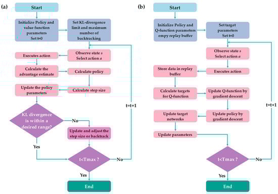 Figure 4 shows flowcharts of the operation process of the TRPO and SAC algorithms. As shown in Figure 4a, in the TRPO algorithm, there is an initialization of policy and value functions’ parameters. Then, it performs an action a selected based on the policy. After an action is executed, the algorithm calculates the advantage estimate based on the current value function and estimates the policy gradient to update parameters. The TRPO is different from SAC in that it provides stability through the regulation of step sizes and Kullback-Leibler (KL) divergence monitoring. The algorithm improves its policy every iteration to provide maximum cumulative rewards. This process continues until it meets the desired policy divergence. On the other hand, in the SAC algorithm, the Actor generates actions through a decision function, while the Critic makes predictions based on the actions taken by the Actor. After initializing the policy parameters, the system obtains the state s from the environment. The Actor randomly executes an action a, and the Critic evaluates this action based on the s and a. The data, including s, a, the next state sʹ, reward r, and done signal d, are stored in the replay buffer. The Actor leverages the critic evaluation to maximize entropy. The Critic compares its evaluation with the reward value from the environmental feedback. Finally, back-propagation is employed to update the network parameters, as illustrated in Figure 4b.