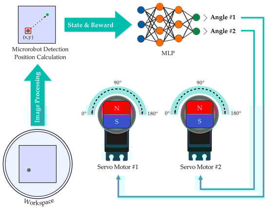 The SAC and TRPO algorithms were implemented on an Acer Aspire 3 A315-57G-77K6 laptop (Acer Inc., New Taipei City, Taiwan) with an Intel i7 1065G7 CPU and 8 GB RAM (Intel Corporation, Santa Clara, CA, USA). This laptop received the microrobot’s position via the overhead camera and image processing, then transmitted the permanent magnet angles to the Raspberry Pi through a TCP/IP communication protocol using a local Wi-Fi network and the socket library in Python. After receiving the data, the Raspberry Pi sent it to the PCA9685 driver module through the I2C communication protocol, and this module transmitted the obtained angles to the corresponding servo motors (Figure 5).