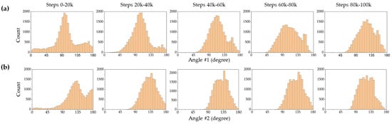 The SAC network outputs (actions) distribution diagram at various time steps: (a) angles of the first permanent magnet, (b) angles of the second permanent magnet.