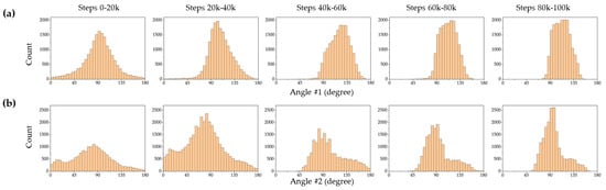 In this study, two different model-free DRL algorithms, TRPO (an on-policy algorithm) and SAC (an off-policy algorithm) were employed to find optimal policies for closed-loop control of a magnetic microrobot on a fluid surface with no prior knowledge of the system dynamic. Frequency distribution diagrams of actions were plotted to gain insights into the SAC and TRPO algorithms’ behavior and performance. These diagrams provide a visual representation of how frequently certain actions are chosen during the learning process. Figure 6 and Figure 7 depict frequency distribution diagrams of the SAC and TRPO algorithm action outputs, respectively, displaying angle 1 (the angle of the first magnet rotated by the servo motor #1) and angle 2 (the angle of the second magnet rotated by the servo motor #2). These histograms are categorized into five intervals: 0–20 k time steps, 20 k–40 k time steps, 40 k–60 k time steps, 60 k–80 k time steps, and 80 k–100 k time steps. These five distinct intervals allow us to analyze the evolution of action distributions over different training phases. Over the initial 20 k time steps, the action distributions are concentrated around a peak, except for angle #2 in the SAC (Figure 6b), which displays two sharp peaks. This indicates that the SAC network tended to rotate the second magnet more frequently with angles exceeding 90°, while the TRPO network tried to rotate both magnets similarly, exploring the entire action space and identifying patterns related to state changes. In this phase, the microrobot explored all possible states within the workspace and exhibited the lowest success rate in reaching the target positions. In the subsequent time steps, from 20 k to 60 k, both networks explore a wider range of angles. Between 60 k and 100 k time steps, the action distributions become more skewed, with some histograms shifted on one side. This implies that both networks discovered near-optimal policies and learned to favor certain angles over others. Notably, at the final 20 k time steps, the action distributions became more uniform and flat (except for angle #2 in the TRPO, as shown in Figure 7b), with some histograms showing almost no peaks. In this phase, the microrobot exhibited more precise and successful navigation toward the target positions. It is important to highlight that in the initial steps, the agents generated non-valid angles (less than zero degrees and more than 180°), which is a natural part of the exploration process for the algorithms. However, as learning progressed, both algorithms effectively learned to avoid selecting invalid angles. In the last 20 k time steps, particularly in the case of the TRPO, they even avoided choosing angles between 170 to 180°.
