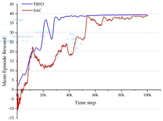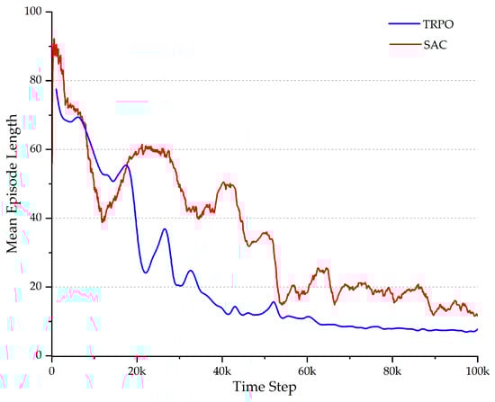 During the training, the SAC algorithm exhibited frequent fluctuations and huge drops in performance, while the TRPO algorithm maintained greater stability and demonstrated relatively fewer fluctuations. SAC uses stochastic policies that add randomness to actions by including an entropy term. Although this may improve exploration, it also can result in fluctuations in performance. The TRPO, on the other hand, optimizes deterministic policies, which generally exhibit less variability in behavior.