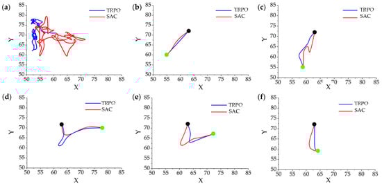 Representative trajectories from an initial position (black circle) at different learning episodes for the microrobot, using SAC and TRPO: (a) the first episode with 100 time steps, (b–f) the final episodes, each with different targets (green circles). (The graphs’ units are represented in pixels).