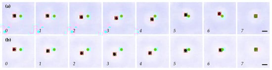 Figure 11 illustrates a time-lapse image of the magnetic microrobot’s trajectory during one of the episodes of the evaluation process of the SAC (Figure 11a) and TRPO (Figure 11b) algorithms in the physical environment. Each episode consists of seven time steps. As is evident from the figure, both algorithms successfully applied their experience gained during the training to navigate the microrobot to the target position. It is important to highlight that to assess the algorithms’ performance in scenarios where they had not been trained, the microrobot’s initial position and the target positions during the evaluation differed from those in the training phase.