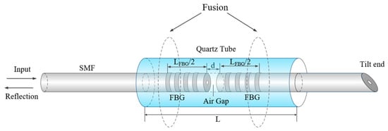Figure 1 depicts the schematic diagram of the g-FBG sensor, a fiber optic sensor. The sensor structure comprises two sub-gratings cut from the original fiber Bragg grating (FBG), positioned in the middle of a quartz tube and fixed within it through fusion splicing. An air gap exists between these two sub-gratings. Together, these two sub-gratings with air gaps constitute a PSFBG and an FPI. Fiber processing involves the use of an inclined cutting method to minimize back-reflections from the fiber-cutting surfaces. This design allows the sensor to respond to variations in strain and temperature in the environment. Monitoring the changes in the reflected spectra in two different states enables the measurement of these physical quantities. Figure 2 illustrates the schematic representations of the sensor’s reflected spectra in two distinct states.