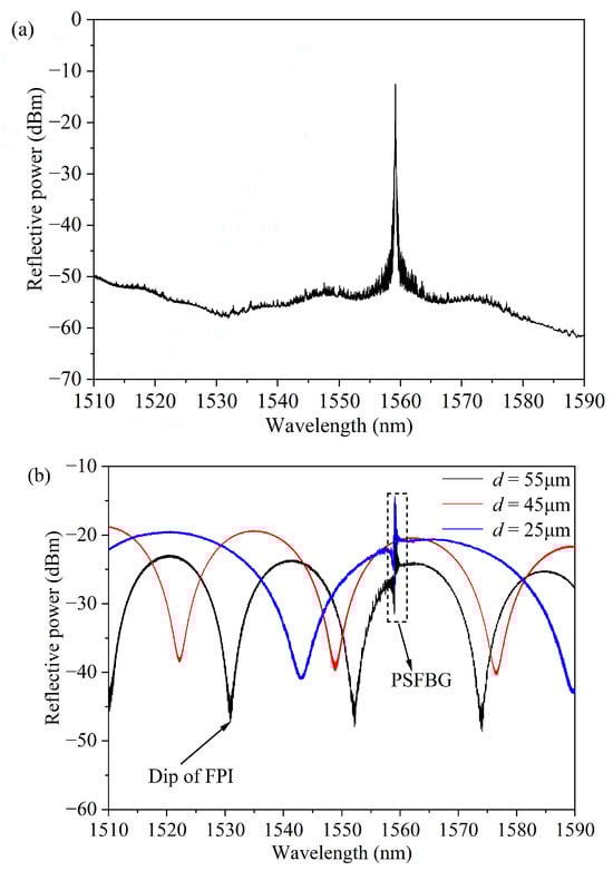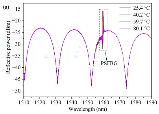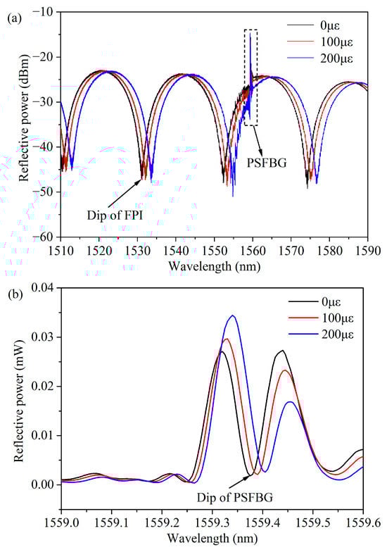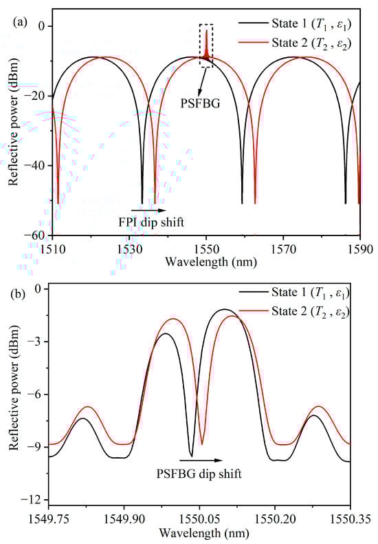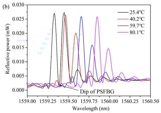 Like FPI, PSFBG exhibits a linear relationship between the wavelength shift of its reflection spectrum and the variations in strain (Δε) and temperature (ΔT). The wavelength shift ΔλPSFBG of its dip can be described by the following formula []: