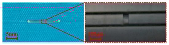 Figure 3 shows a physical picture of the g-FBG sensor. The parameters of the sample g-FBG sensor are L = 15 mm and LFBG = 10 mm, where L is the length of the quartz tube, LFBG is the length of the initial FBG. The spectra of the FBG used are shown in Figure 4a, and the Bragg wavelength (λB) of the used FBG is about 1559.376 nm. The spectrum of the g-FBG sensor under different gap spacings is shown in Figure 4b. When d = 55 µm, the FSR is about 21.241 nm, and the contrast is about 24.56 dB. As the gap decreases, the FSR of the FPI increases. When d = 25 µm, the FSR is about 46.932 nm, and the contrast is about 21.42 dB. As can be seen from Figure 4b, the dip of FPI is sharper, so the sensor with d = 55 µm is selected for the experiment of simultaneous temperature and strain sensing.