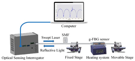 Figure 5 illustrates the schematic diagram of the experimental setup designed for the simultaneous detection of changes in strain and temperature. An optical sensing interrogator (SM125, Micron Optics, with a spectral range from 1510 nm to 1590 nm and a spectral resolution of 1 pm) is utilized to monitor the reflection spectrum of the g-FBG sensor.