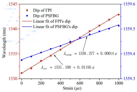 Hence, in accordance with Equation (7), by measuring the reflected dip of PSFBG and the interference dip of FPI, it is possible to simultaneously determine both strain and temperature.