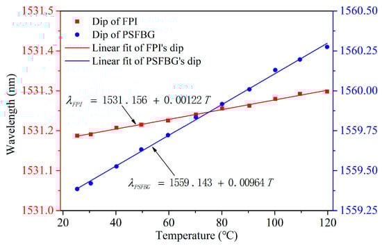 As shown in Figure 8b, the reflective dip wavelength of PSFBG shifts toward a longer wavelength when temperature rises. The measurement resolution can be relatively high owing to a narrow bandwidth (~58 pm@3 dB) of the reflective dip of PSFBG. Figure 9 illustrates the trend of the center wavelength of the dip as a function of temperature. The center wavelength of the dip shifts slightly from 1531.187 nm to 1531.298 nm, with a corresponding temperature sensitivity KFPIT of only 1.22 pm/°C. Simultaneously, the center wavelength of the peak linearly shifts from 1559.385 nm to 1560.275 nm, with a corresponding temperature sensitivity KPSFBGT of 9.64 pm/°C, approximately eight times greater than KFPIT.
