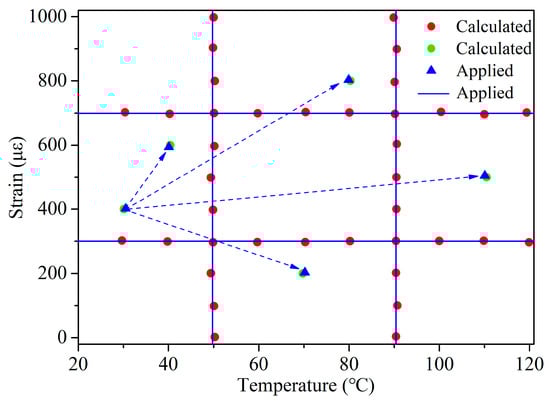 To validate the stability of the sensor, two experiments were conducted. Firstly, under constant temperature conditions, strain was continuously applied to the sensor; then, under constant strain conditions, temperature was continuously applied to the sensor. The red points and blue lines in Figure 10 represent the calculated and applied values, respectively. Additionally, to better simulate the actual situation, synchronous measurements under a fixed initial state (30 °C, 400 με), of both strain and temperature, were simultaneously varied. The green and blue points in Figure 10 correspond to the calculated and applied values. It is observed that there is a minimal difference between the calculated values obtained through the sensing matrix and the actual applied values. We speculate that this difference may arise from uncertainties in measuring the applied values, such as the output of the digital temperature gauge in the heating system and the wavelengths recorded by the optical interrogator for FPI and PSFBG.
