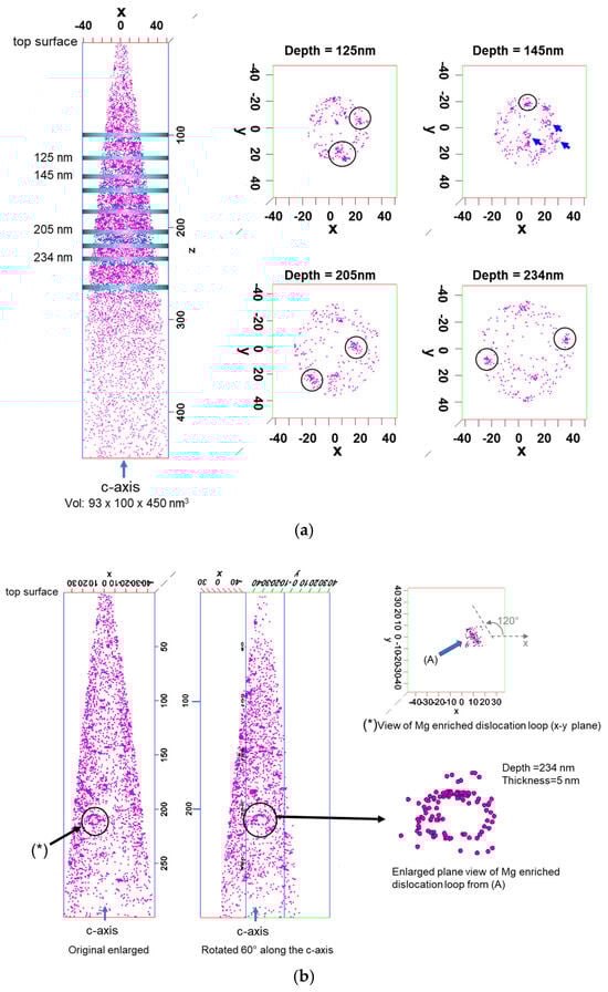 The Mg distribution was confirmed not to be uniformly distributed laterally within 5 nm depth steps. Most of the Mg-enriched features were identified as clusters, shown as circles in the figure, while at the depth with the maximum Mg concentration, i.e., ~145 nm, a few Mg-enriched features were close to a loop shape (as shown by blue arrows). A more detailed analysis was carried out by rotating 60° along the c-axis of the graph of the Mg atom distribution measured using a needle-shaped specimen, as shown in Figure 2b. The Mg distribution at a depth of 234 nm showed a Mg-enriched dislocation loop parallel to the c-axis but not parallel to either the x-c or y-c plane. The estimated angle between the loop plane and the x-c plane was found to be about 60°.