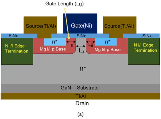 A schematic cross-section of the ion-implanted GaN DMISFET on the free-standing GaN substrate is shown in Figure 3a. The device structure resembles GaN or Ga2O3 CAVETs [,], but the fabrication process was different. Only ion implantation was used for the doping process, and the device structure was similar to that of SiC or Si DMOSFETs. Channel regions were fabricated in Mg-implanted layers with a tilt angle of 30°, and the gate length was defined in a self-aligned manner by the difference in the lateral range between Mg and Si under the SiNx gate insulator.