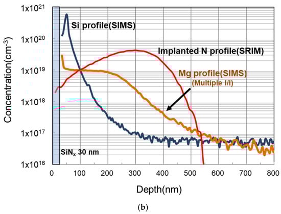 The fabrication process of the DMISFET was almost the same as in a previous paper [], but it was different in some important points, as described below. SiNx gate dielectric films of a 50 nm thickness were sputtered in N2 gas ambient. Edge termination regions were also formed via the ion implantation of N at an energy of 100 keV and a dose of 1.0 × 1015 cm−2 []. The device structure has a flattened surface with N-ion-implanted termination compared to the etched one [], making it possible to create small devices with complex wiring. The implanted Mg and Si profiles measured using SIMS after annealing are shown in Figure 3b. Substituted Ga atoms or damage layers of about 0.1% were produced by N implantation, corresponding to a maximum implanted N concentration of 5 × 1019 cm−3. Then, the leakage current between the adjacent n-type regions above 2 μm in a p-type layer was suppressed to less than 1 μA/mm. The depth of N-implanted termination was estimated to be 0.4 μm. The Mg surface concentration in the DMISFET channel regions was also estimated to be 5.0 × 1018 cm−3.