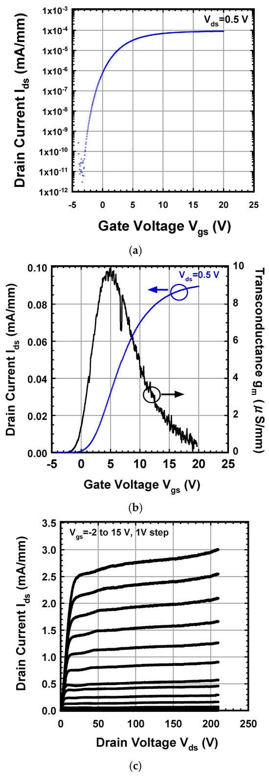 (a) Subthreshold characteristics of the DMISFET. (b) Ids-Vgs and gm-Vgs characteristics of the DMISFET. (c) Pulsed Ids-Vds characteristics of the DMISFET. (d) Off-state Ids-Vds characteristics of the DMISFET. The breakdown voltage in off-state was 417 V.