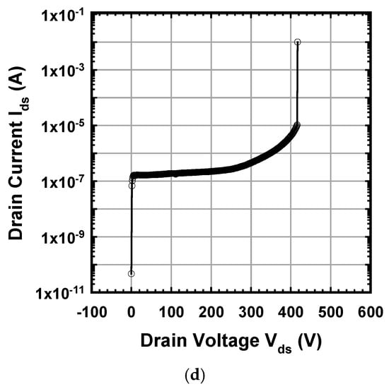 The pulsed Ids-Vds characteristics of the DMISFET by sweep of the Vgs value from −2 V to 15 V are shown in Figure 4c. Idsm and gmmax in the saturation region, at a Vds of 100 V, were 2.8 mA/mm and 0.5 mS/mm. Idsm and gmmax were low compared to those in other reports [,] because the channel regions under the gate insulators included crystal defects. The reason why Id and gm increased in the saturation region when the drain voltages were over 150 V is considered to be as follows: In the DMISFET structure in which a channel region with a gate length of 0.4 μm [] is formed by the lateral double diffusion of Mg and Si, the drain current increases due to Drain-Induced Barrier Lowering (DIBL) []. Forming a highly concentrated p-base region reduces the increase in drain conductance and increases the threshold; however, it also lowers Ids and gm as a disadvantage. The off-state Ids-Vds characteristics of the fabricated GaN DMISFET are shown in Figure 4d. The breakdown voltage was 417 V, which was lower than the expected value for an epitaxial layer thickness of 5 μm.