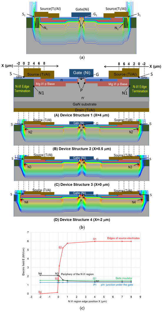 To find the breakdown points in the device, a 2D simulation was carried out to investigate the electric field inside the device. The N I/I termination region was calculated as an insulator with a dielectric constant of 8.9. Simulated contours with an electric field strength of Vds = 100 V are shown in Figure 5a, where the contours with high electric fields are illustrated in red and those with low electric fields are illustrated in blue. The electric field is low in the n- epitaxial region and highly concentrated in the gate insulator (G1), at the p/n- junction under the gate (P1), at the periphery of the N-ion-implanted (N I/I) region under the Mg-implanted layer (N1) and in the insulator regions including the N I/I region under the edges of the source electrodes (S1). To clarify the influence of the N I/I termination regions on the electric field, a simulation was conducted for the devices with different positions of the N I/I region, as shown in Figure 5b. Device Structure 1 is similar to the fabricated device. The N I/I region edge of this structure is located at X = 4 μm and overlaps the source electrodes. The N I/I region edges of Device Structures 2 and 3 are located at X = 0.5 μm and 0 μm. The N I/I region edge of Device Structure 4 is located at X = −2 μm; i.e., the edges of the source electrodes are in the Mg-implanted p-base regions. The drain and GaN substrate layers are not shown in Device Structures 2–4 for simplicity. The simulated contours of the electric field strength at Vds = 100 V are also shown. It is considered that the electric field strength is higher at the end of the source electrode and at the periphery of the N I/I region than in other locations.