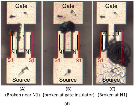 The simulated electric fields at Vds = 100 V for the devices with N I/I region edges from X = −2 μm to 8 μm are shown in Figure 5c. At points G and P, the electric fields are constant and do not change, even if N I/I layer edge position X changes. When position X is between 0 μm and 1 μm, the electric fields at the source contact edge, S, increase rapidly, while the electric fields at the N I/I layer edge, N, decrease. If the periphery of the N I/I region under the Mg-implanted layer, N, is located outside the source contact edge (X < 0 μm), the electric field at point S will be the lowest, and the electric field at point N will be the highest. This structure corresponds to the unit cell of the multi-finger power transistor. For Device Structure 1 (X = 4 μm), the breakdown point is estimated to be the source contact edges, as S1 is equal to 6 MV/cm. Figure 5d shows typical device examples after applying a voltage higher than the breakdown. The broken and solid lines in black indicate the boundary between the Mg-implanted p-base region and the N I/I region, N1, and the lines in red indicate the edges of the source electrodes, S1. It is clear that breakdown points occur near the end of the source electrode or near the boundary between the N I/I region and the Mg-implanted p-base region. Although the electric field at point N1 is not high in the simulated results shown in Figure 5a,c, those devices seem to be broken around point N1. This means that the breakdown voltage is determined by the boundary region between the damaged regions produced by N ion implantation and the Mg-implanted regions with Mg-enriched dislocation loops.