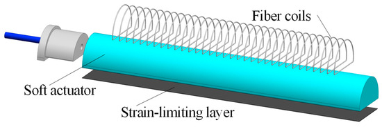 As shown in Figure 1, the first part of the soft actuator is a semi-cylindrical silicone chamber that can be filled with compressed air. The second part is a constraint layer, which is attached to the flat layer of the actuator and can convert the actuator elongation into bending deformation. The third part is a non-extendable coil that is employed to restrain the radial expansion of the silicone chamber so that the soft actuator can only elongate in the axis [31].
