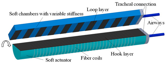 The hook layer of the Velcro is used as the constraint layer of the soft actuator and the loop layer is used as the variable stiffness structure. The flexible connection between the modules is achieved by pasting or separating the hook layer and the loop layer, thus allowing for general or variable stiffness grasping. This innovative design can ensure the reliable and flexible connection between the actuator and the variable stiffness part. Structure of the modular soft actuator with variable stiffness is shown in Figure 2. To ensure that the variable stiffness structure does not wrinkle during bending, the loop layer is cut into strips and arranged evenly on one side of the variable stiffness structure.