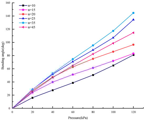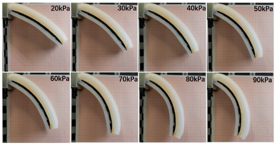 From Figure 13, the bending angle of the soft actuator increases with the increasing of the air pressure. However, the relationship between the bending angle of the soft actuator and the air pressure is nonlinear, and between 70–90 kPa the bending angle of the soft actuator increases exponentially.