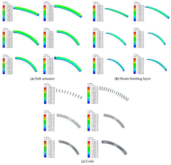 To analyze the stress distribution of the soft actuator, stress clouds of which under the constraint of different coil turns at 60 kPa was investigated. As shown in Figure 6a when the coil turns are small, average stress of the actuator is relatively high and the bending angle is smaller. That is because small number of coils cannot restrain the radial expansion of the actuator. As a result, axial deformation of the actuator will be smaller, that is, the bending angle is smaller. For n = 35, the maximum stress is mainly distributed on the semicircular wall of the actuator and distributed at both ends, which lays foundation for the actuator optimization in the following. Stress clouds of the strain limiting layer with different coil turns at 60 kPa are shown in Figure 6b at the same pressure. When n ≤ 20, the stress concentration is mainly symmetrically distributed along the centerline of the strain-limiting layer. When n ≥ 25, the stress distribution is more uniform, and the average stress is smaller. Stress clouds of the coil with different coil turns at 60 kPa is shown in Figure 6c—the more the coil turns, the smaller the average stress.