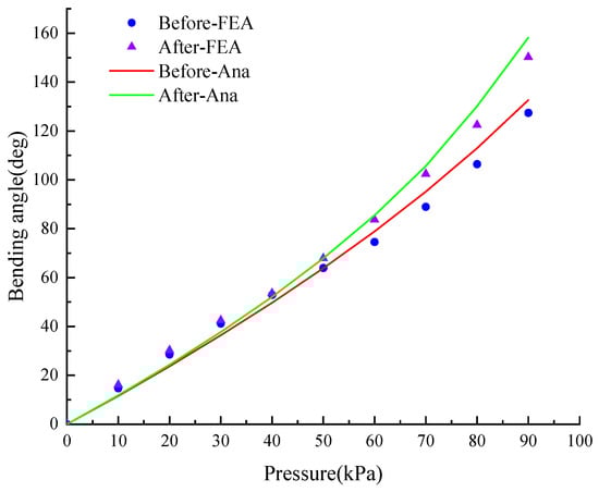 From Figure 7, at the same pressure, when P ≤ 50 kPa, the free bending angle of the optimized actuator is only slightly larger than that of the unoptimized one. When P > 50 kPa, the optimized bending angle is significantly larger than that of the unoptimized one. For nine sets of data under different air pressures, the root means square error between the analytical solution and the finite element analysis (FEA) is 4.8805°.