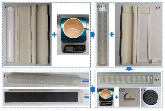Here, the soft actuator is made using the pour and form method. Physical fabrication of the soft actuator is shown in Figure 10. Firstly, the base of the soft actuator is poured and then the coils are wound on its surface and a strain limiting layer is added to its bottom. Finally, the base surface is poured once more. Figure 10a,d are the first and second casting of the mold respectively, and Figure 10i shows the completed soft actuator.