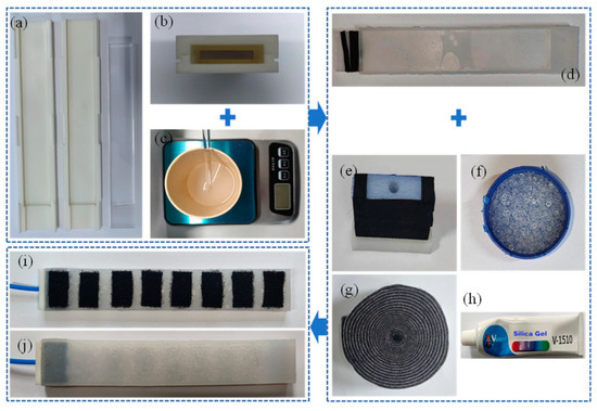 Fabrication process of the variable stiffness structure. (a) Mold. (b) Assembly of mold and core. (c) Silicone solution. (d) Soft cavity. (e) Pipe interface. (f) Particles. (g) Loop layer. (h) Silicone adhesive. (i) Variable stiffness structure. (j) The other side.