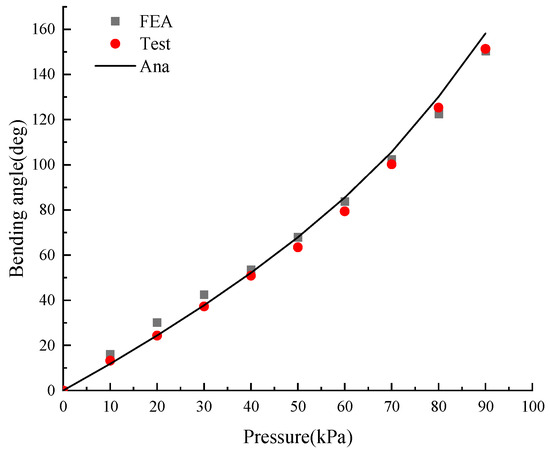 In Figure 14, the experimentally tested bending angle is compared with that of the finite element analysis (FEA) and theoretical calculation (Ana) respectively, and θTest has a root mean square error (RMSE) of 3.8246° and 4.2037° with respect to θFEA and θAna. Experiments show that the difference between the test value and the theoretical value is quite small, which verifies the correctness of the statics model of the soft actuator.