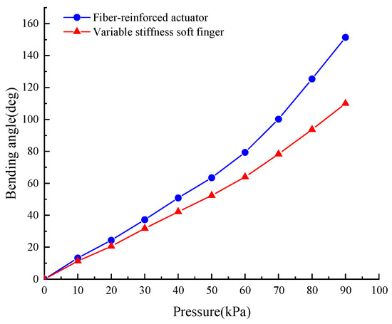 As shown in Figure 15 and Figure 16, the bending angle of the soft actuator with the variable stiffness structure is smaller than that of the soft actuator under the same air pressure, and the difference in bending angle between these two actuators increases with the increasing of air pressure. It is obvious that the variable stiffness structure can prevent the soft actuator from bending. As the air pressure increases, obstruction of the particles in the stiffening structure becomes more pronounced. However, the soft actuator with variable stiffness bends well under 70–90 kPa, which provides a basis for grasping various objects.