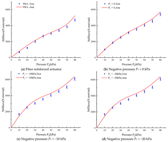 As for the soft actuator stiffness, comparison of the experiments with the theoretical calculation is shown in Figure 17. It can be seen that the proposed stiffness model for the soft actuator with variable stiffness is effective in predicting the stiffness change with air pressure changes. However, the experimental results are slightly smaller than that of the theoretical calculations, possibly because the elastic force of strain limiting layer in the soft actuator is neglected.