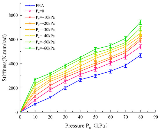 From Figure 18, under the same Pa, stiffness of the soft actuator with variable stiffness is greater than that of the fiber reinforced actuators, even without negative pressure. This is because the variable stiffness structure bends passively and causes the particles blockage, thereby improving the stiffness of the entire soft actuator. In addition, the stiffness of both the soft actuator and the variable stiffness soft actuator increases steadily as Pa increases. Under the same Pa, stiffness of the actuator with variable stiffness increases with the negative pressure increasing, and the area between the curve Pv = 0 and the Pv = −60 kPa is roughly the range of adjustable stiffness. This indicates that the adjustment range of stiffness of the modular variable stiffness soft actuator is relatively large, and allows the flexible use of the soft grippers for different grasping tasks.