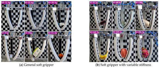 As shown in Figure 20b, the load-bearing capacity of the soft gripper with variable stiffness is much higher than that of the general soft gripper. At a positive pressure of Pa = 60 kPa and Pv = −30 kPa, the maximum grasping weight of the soft gripper with variable stiffness can reach 1313 g, approximately 1.84 times the load-bearing capacity of a general soft gripper.