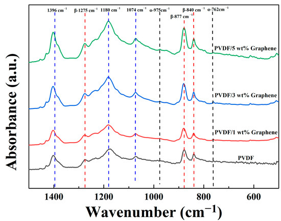 The FTIR analysis results of the piezoelectric fibers in the wavenumber range of 500 cm−1 to 1500 cm−1 exhibit absorption peaks for pure PVDF and 1 wt%, 3 wt%, and 5% wt% PVDF/graphene compositions.