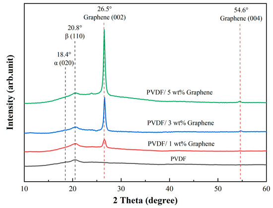 Figure 2 illustrates the X-ray diffraction patterns of the prepared fibers in this study. The characteristic peak of the PVDF fibers is approximately 18.4°, corresponding to (020). This peak transforms into a broadened peak, suggesting a partial transformation from the α-phase to the β-phase in the PVDF fibers. Additionally, the diffraction peak at 2θ angles mainly occurs at 20.8°, corresponding to the (110) crystal planes, becoming the prominent characteristic peak, indicating the presence of the β-phase in the material [58]. For fibers with the addition of 5 wt% graphene, two characteristic peaks are observed at around 26.5° and 54.6°, corresponding to the reflections of the graphene crystal planes (002) and (004), respectively [59]. These two characteristic peaks are commonly observed in the X-ray diffraction pattern of graphene. The PVDF solution with the addition of graphene exhibits a significant increase in the peak intensity associated with the β-phase compared to the original PVDF solution without graphene. The addition of 3 wt% and 5 wt% graphene shows the presence of a characteristic peak at 54.6° (004), while 1 wt% graphene does not exhibit a characteristic peak at this position. This may be attributed to the lower concentration of 1 wt% graphene, resulting in insufficient crystal content, and the characteristic peak may be very weak or challenging to detect. However, adding a low concentration of 1 wt% graphene enhances the β-phase. With the increase in graphene concentration, the characteristic peak at 26.5° (002) becomes sharper, indicating an improvement in the crystallinity of the sample.